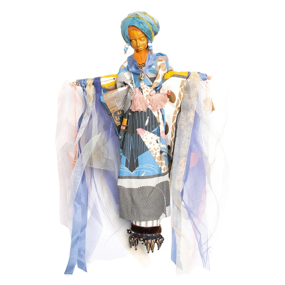 Crafted from a diverse selection of couture and vintage fabrics, these dolls draw inspiration from cultures around the world. Each piece carries a symbolic money bag or purse, representing prosperity, along with an antique optical lens, signifying clarity and vision. Adorned with trade beads, feathers, and other intricate embellishments, these dolls are a true testament to artistry and craftsmanship.